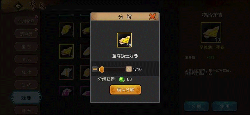 觉醒丹作为武将觉醒中重要的材料,然而噩梦副本每日产出太过有限。普通玩家也没有充足的金币可供金币探宝收集觉醒丹等资源,这时我们可以将暂时用不到的残卷分解,这种“杀鸡取卵”的方式虽然不可取,但很实用,分解品质较高的残卷,能最大化的资源整合利用,获取大量的觉醒丹,从而提升武将觉醒的进度。
