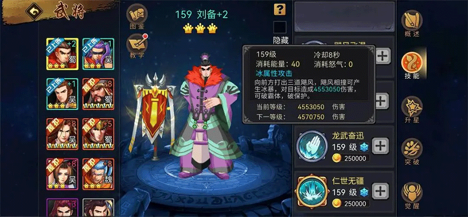 但付出终归是有回报的,技级的高低与伤害水平直接挂钩,技能伤害为该技能命中时造成的直接伤害,决定了武将技能的单次伤害水平,技能等级越高伤害越充分。建议角色等级提升优先同步主力武将技能等级,再兼顾援护武将和守城武将。