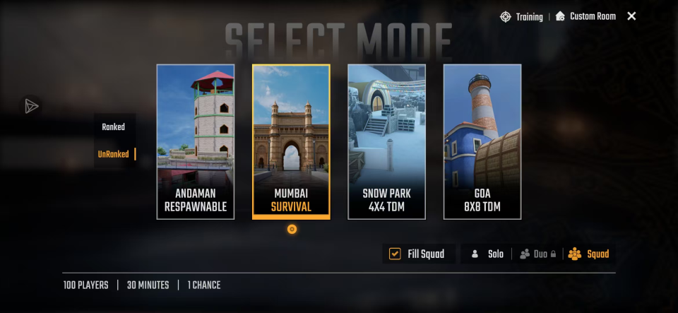 2、生存模式(孟买地图)100 人同场竞技,没有复活机会,挑战极限。