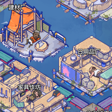 切鱼厂、材料厂、海水提取厂、服装作坊、海产厨房、日用品厂、建材厂、金属厂、选种厂、农作物厨房、家具作坊、玩具厂、药品厂、农田等。