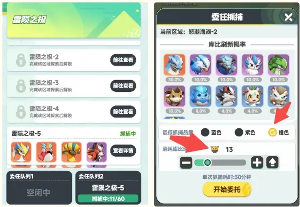 当训练师达到14级,完成某个区域的探索后,即可解锁该区域的委任抓捕功能。训练师可以结合小地图,优先探索并解锁你最需要的库比区域,以便后续快速委任。