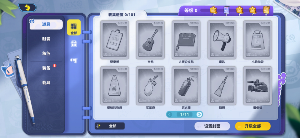 日常道具(书包、黑板擦)与魔性道具(香蕉枪、喷气背包)组合出千奇百怪的情景;时装涵盖校服、职业装到超人皮套等,部分解锁专属动作与隐藏玩法。