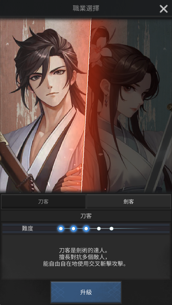 3、物理系分为刀客和剑客,魔法系分为气功师和拳法家,其中刀客和气功师更为简单适合新手,如果你是老手或者想要更大难度可以选择拳法家。