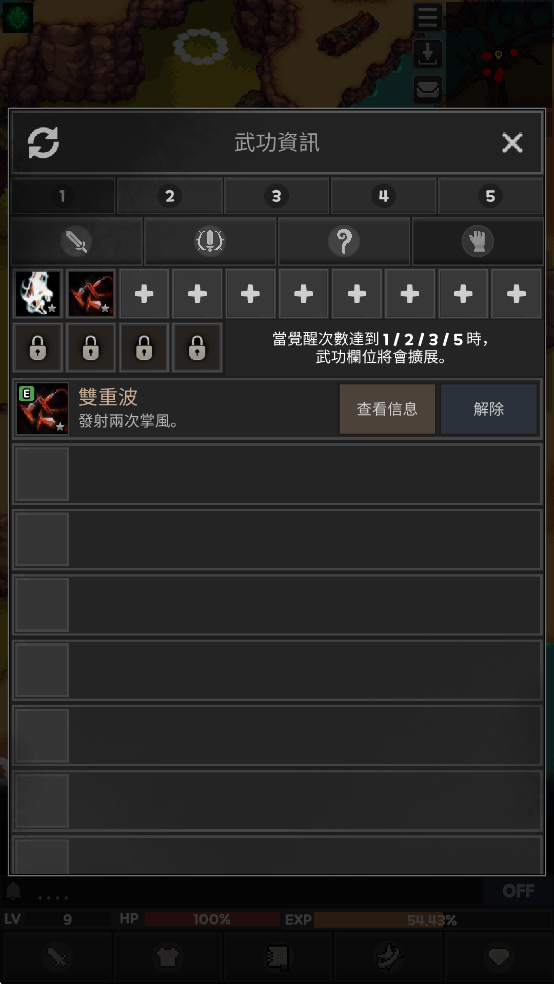 6、通关修行逐渐学习武功秘籍,学会便可装配技能,多学习武功,慢慢去称霸武林吧。