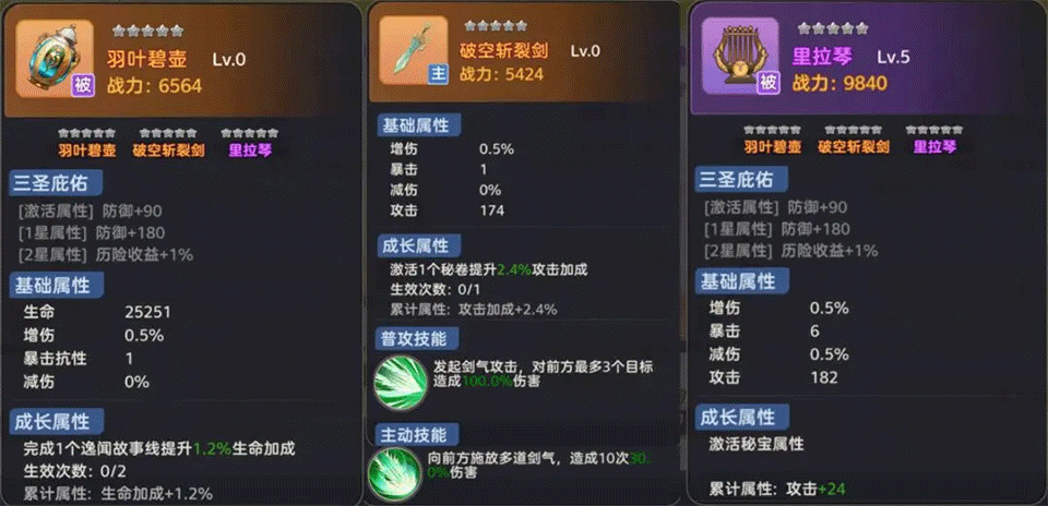 【三圣庇佑】分为三件秘宝组成一个套装,当同时拥有套装里的三件秘宝时,就可以激活套装效果。
