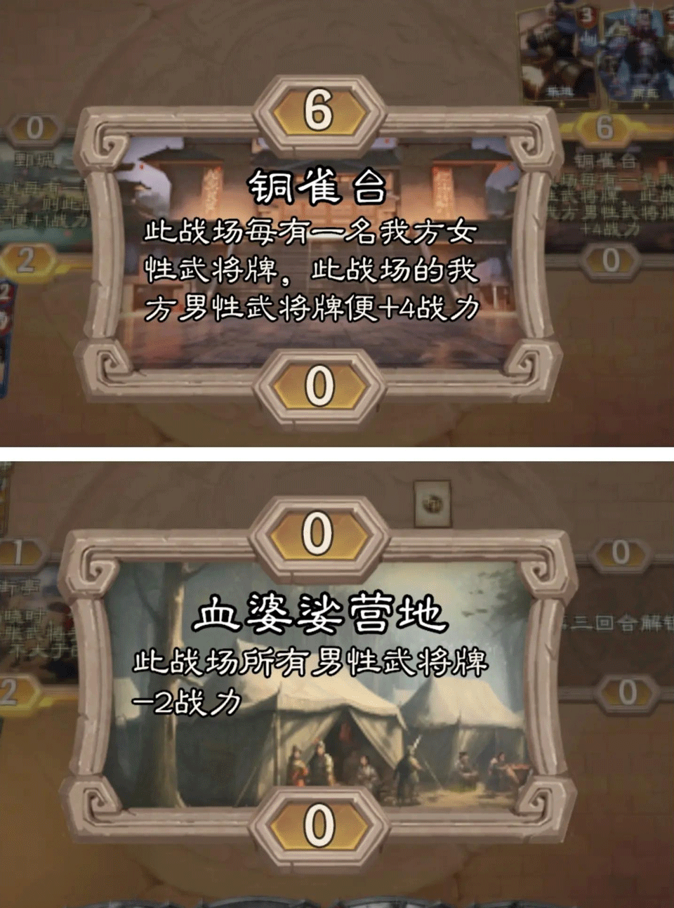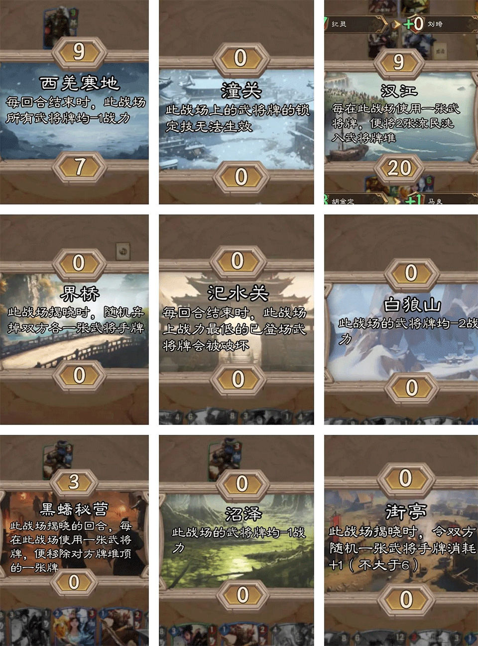 【对局规则】:6个回合,每回合依次给1/2/3/4/5/6点能量,武将卡牌左上角为出场所需能量值,右上角为战力,个别时候会受对手和战场影响有所波动。中间区域的战场每回合揭露一个,三个回合揭露全部。