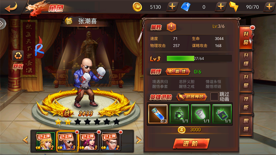 6、随着关卡的解锁游戏难度也会逐渐递增,因此你需要及时对角色进行升级、生品、升星来提升角色的战斗力等属性