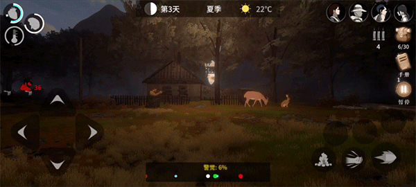 野外狩猎区栖息着各类野生动物,主要分为大型动物和小动物,猎杀大型动物需要使用弹药并且可以获得珍贵的动物肉和兽皮,大型动物肉可用于大幅补充体力,兽皮是用于搭建营地的重要材料,如果某个区域内的大型动物被狩猎殆尽,则会陷入灭绝状态,因此狩猎大型动物时务必节制,确保大型动物能繁衍生息持续提供资源。小动物数量繁多,只需潜伏接近即可抓取,是肉类的主要补充来源,部分小动物还可以选择活抓带回营地进行饲养。
